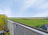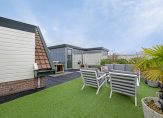 Een van de unique selling points van dit penthouse is het royale dakterras, gesitueerd op het zuidwesten. Het uitzicht over de omliggende bebouwing en het water, met de skyline van Zaandam als achtergronddecor, is fantastisch. Praktische voorzieningen als een buitenkraan, rubberen tegels en een aansluiting voor verlichting zijn aanwezig op het dakterras.