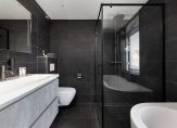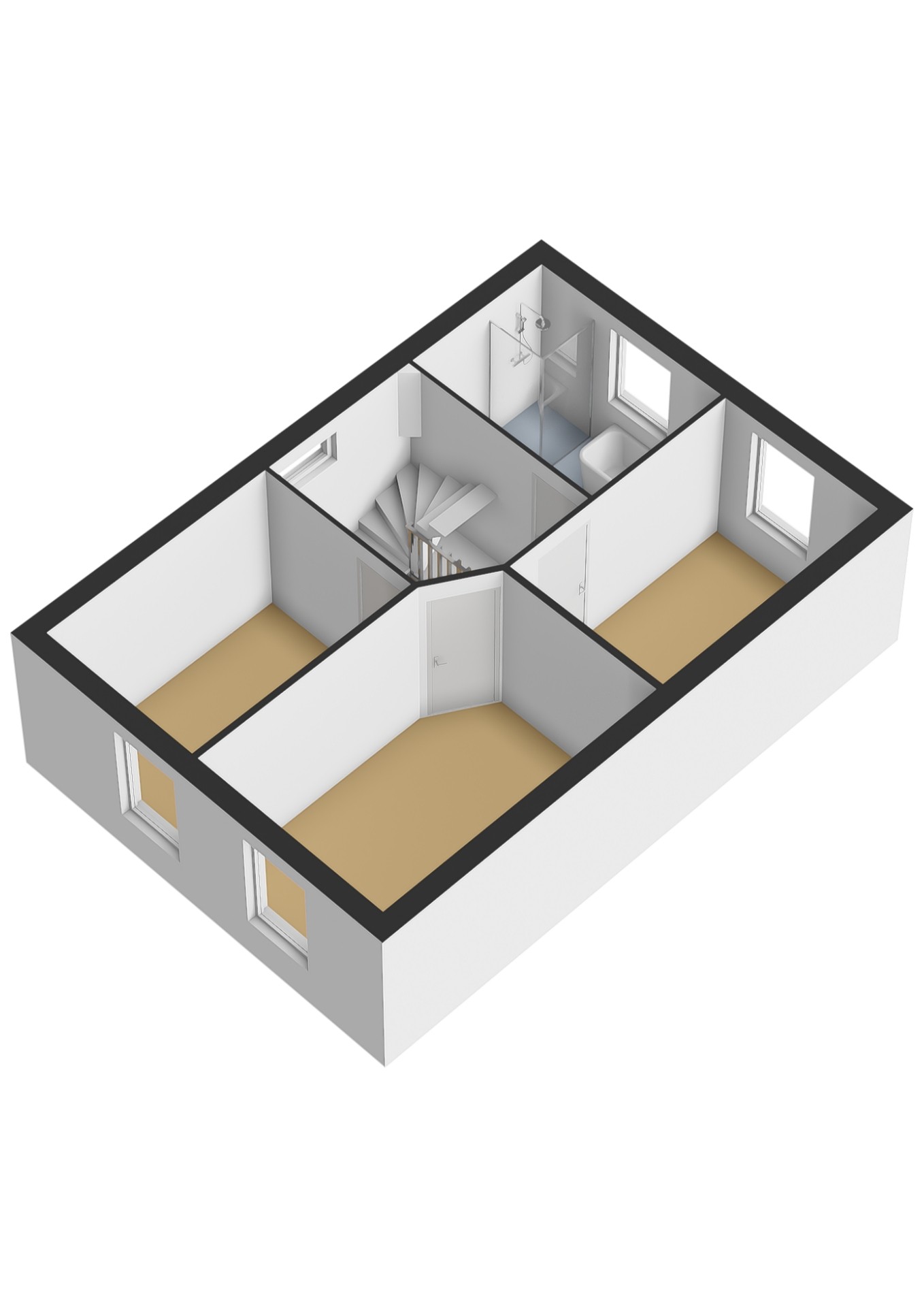 1e Verdieping: overloop – drie slaapkamers – badkamer met ligbad, wastafelmeubel en douchecabine.