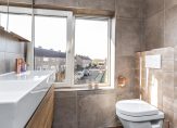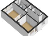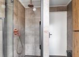 1e Verdieping: overloop – vaste kast en tweede vaste kast met opstelling CV-combiketel – twee slaapkamers – badkamer met wastafelmeubel met dubbele kom, douchehoek met sunshower, toilet – trapopgang naar 2e verdieping.