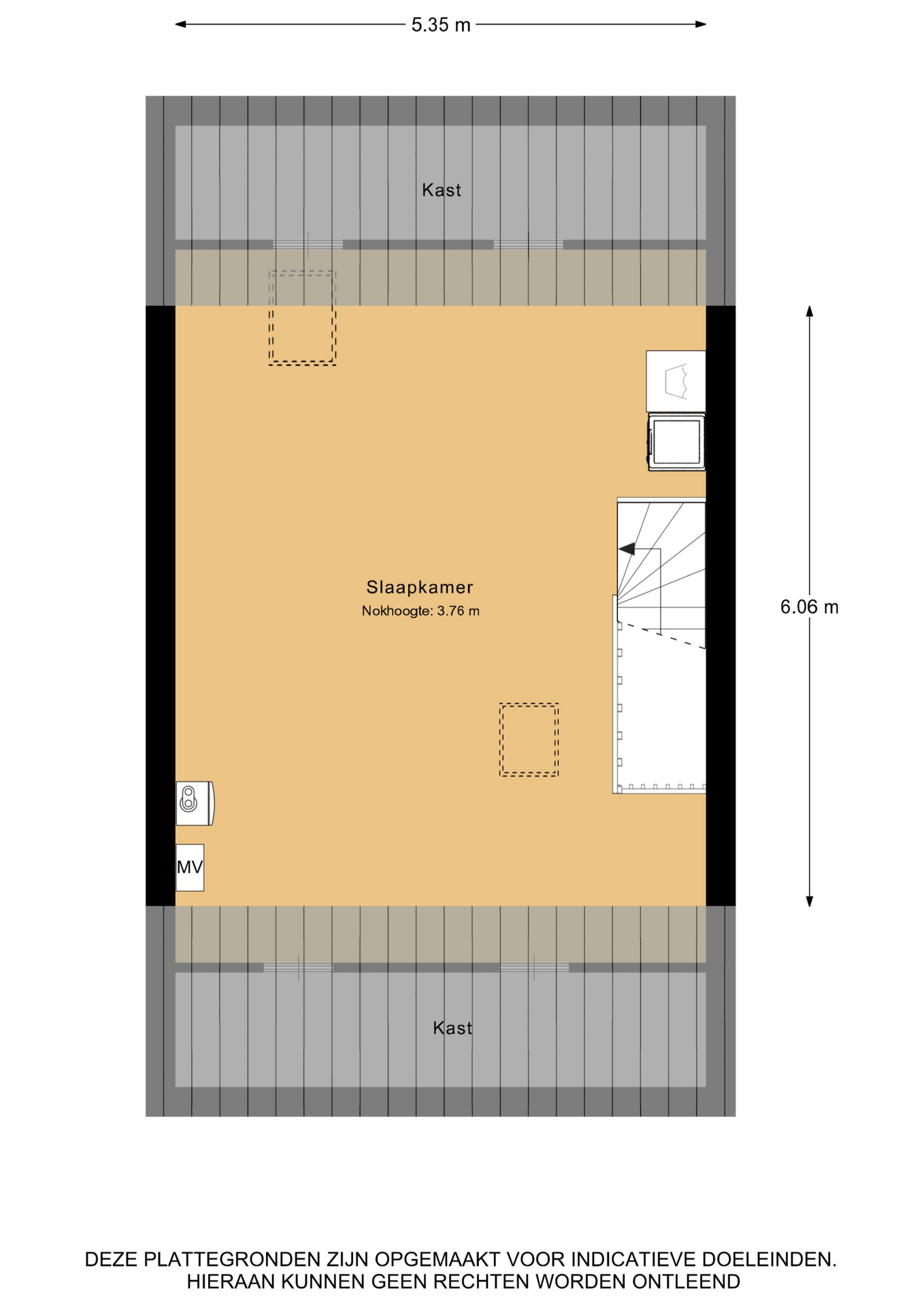 Zeer ruime zolder met dakraam, wasmachine aansluiting en bergruimte achter de knieschotten.