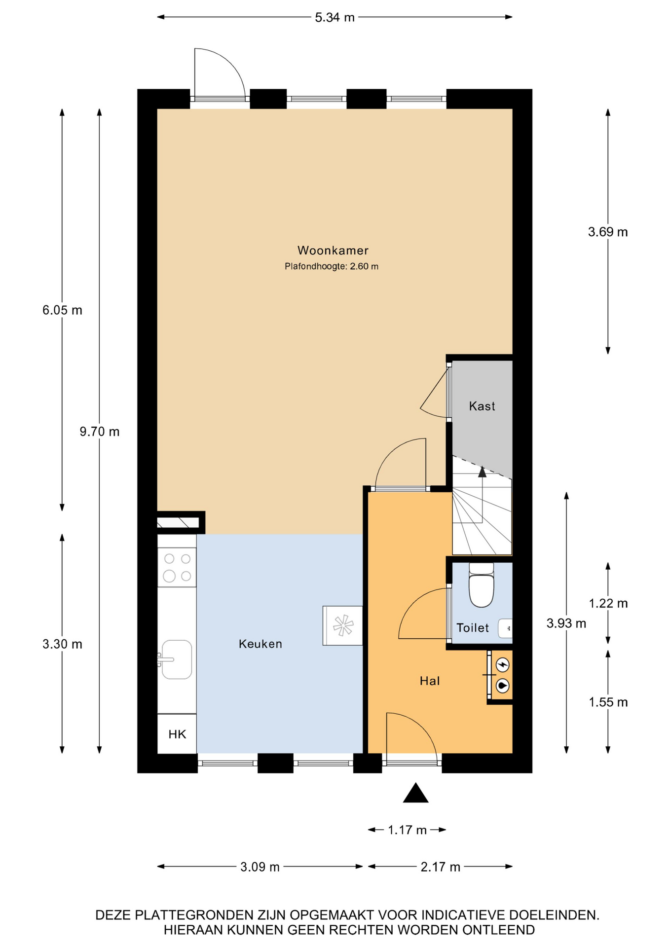 Begane grond: entree/ hal – meterkast – toilet met fonteintje – trapopgang – royale woonkamer – trapkast – open keuken. De moderne keuken in lichte kleurstelling is ingericht met een vaatwasser, keramische kookplaat, afzuigkap, koelkast en combi-magnetron.