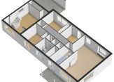 Begane grond: entree/ hal met garderobe en meterkast – gang – woonkamer – keuken met inloopkast – toilet – badkamer met douche, wastafel, toilet en wasmachineopstelling – vaste kast – twee slaapkamers – ruime kamer met vaste kast, wastafel, trapopgang naar 1e verdieping en achteringang.