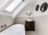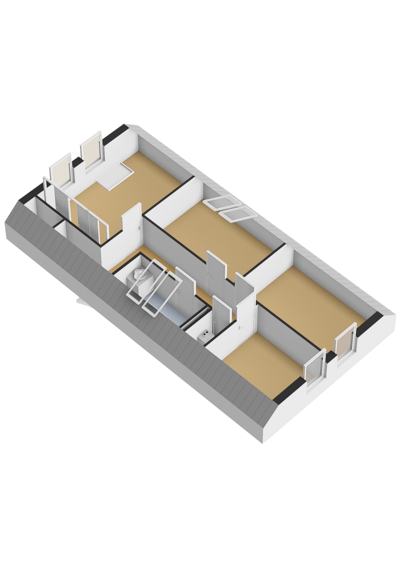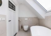 1e Verdieping: overloop – totaal vier slaapkamers – badkamer met ligbad, toilet en wastafel.