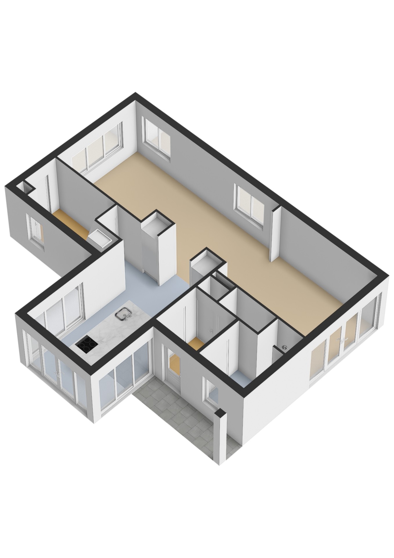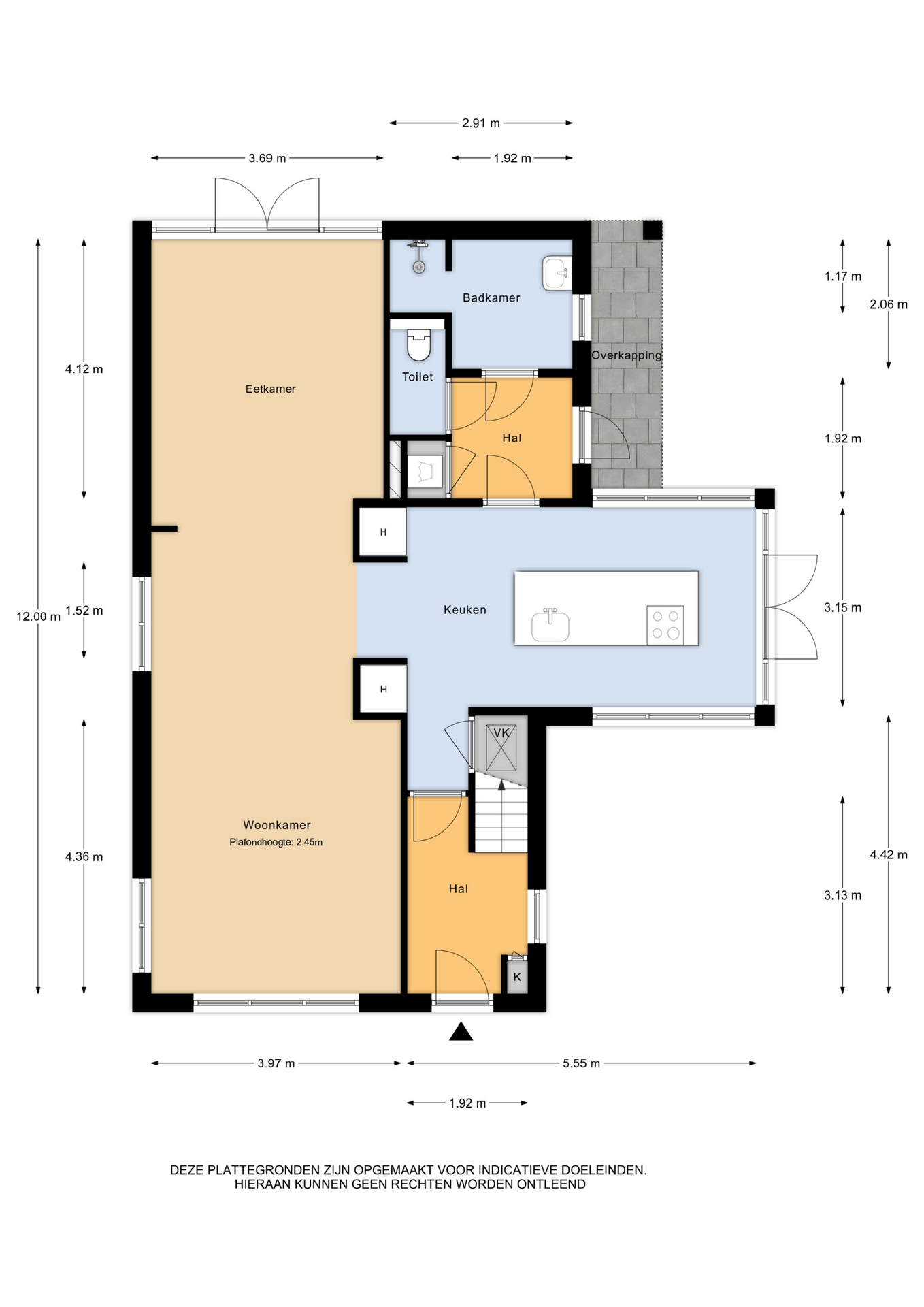 Begane grond: hal/ entree – trapopgang – meterkast – trapkast met toegang tot een provisiekelder – woonkeuken met kookeiland en openslaande deuren naar het terras – woonkamer met openslaande deuren naar de tuin – bijkeuken – vaste kast met opstelling wasmachine en droger – badkamer met inloopdouche en mogelijkheid voor aansluiten wastafel.
