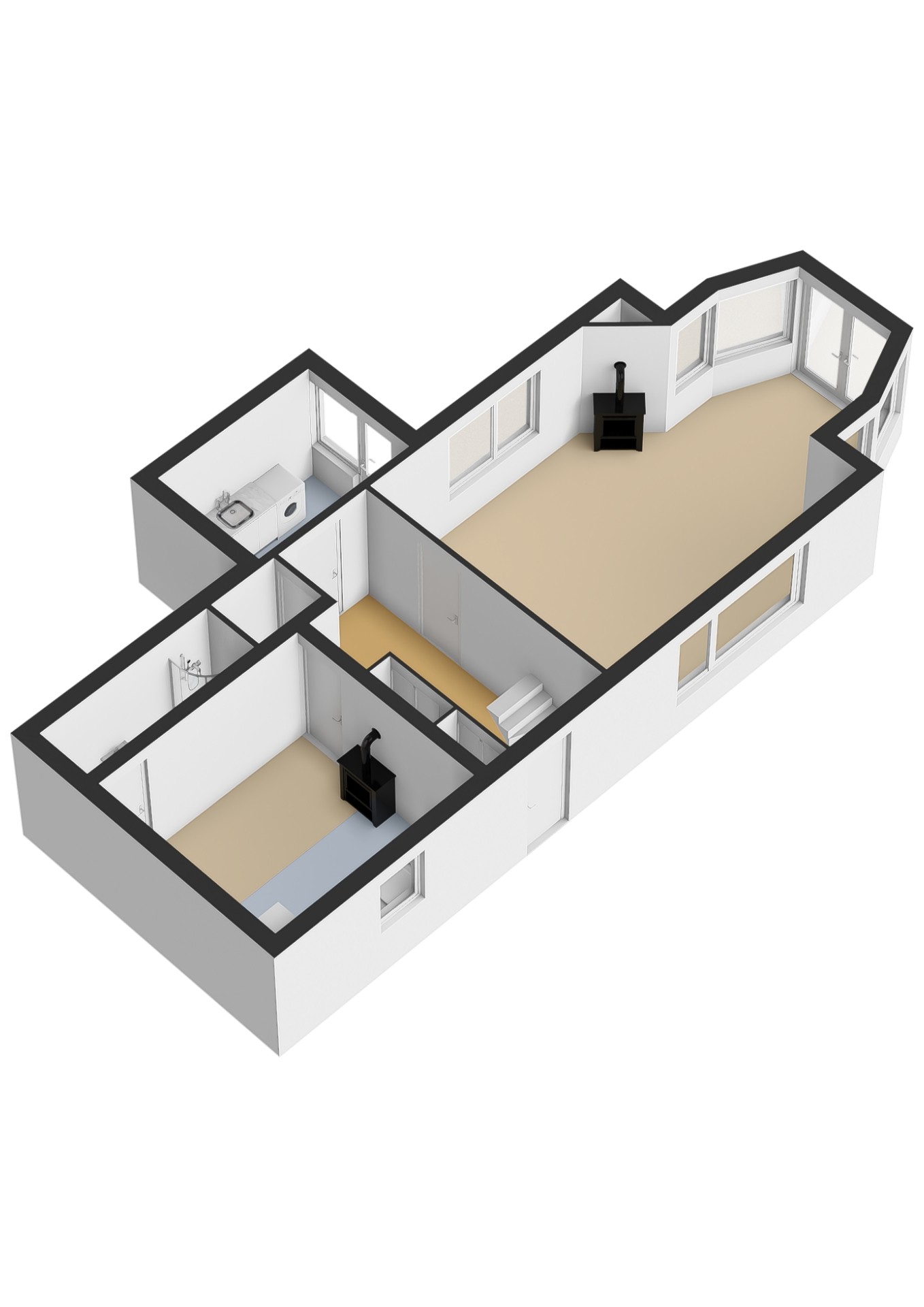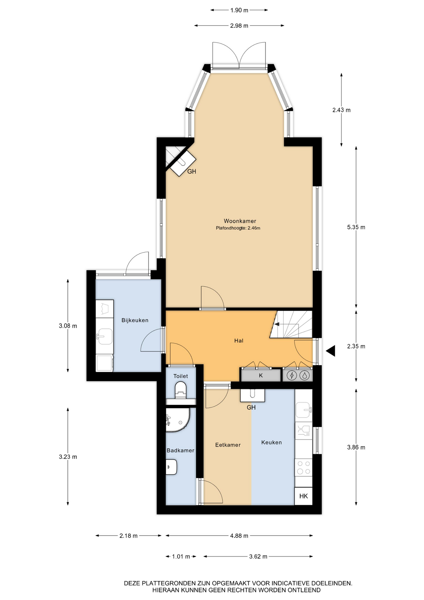 Begane grond: entree/ hal – meterkast – toilet – woonkeuken – badkamer met douchecabine, wastafel en toiletkast – lichte en ruime woonkamer met openslaande deuren naar de tuin – bijkeuken met keukenblok, wasmachineaansluiting en achteringang.