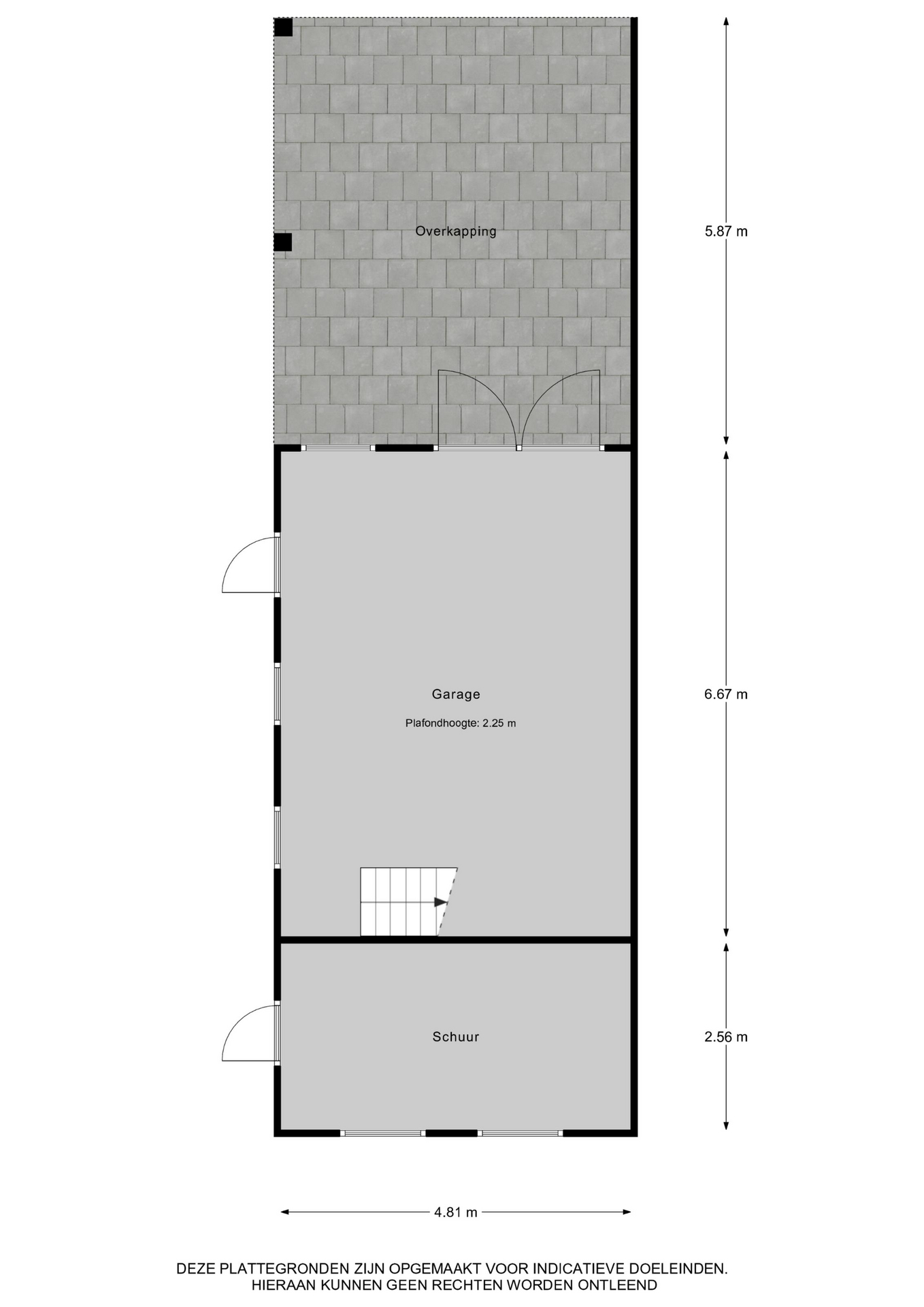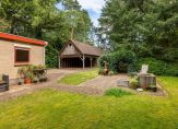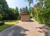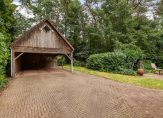 De vrijstaande houten garage met carport voor twee auto’s, heeft een dubbele deur, waterkraan aan de buitenzijde en royale bergzolder van 15 meter lang die middels een vaste trap te bereiken is. Aan de achterzijde van de garage is een aparte fietsenschuur.
