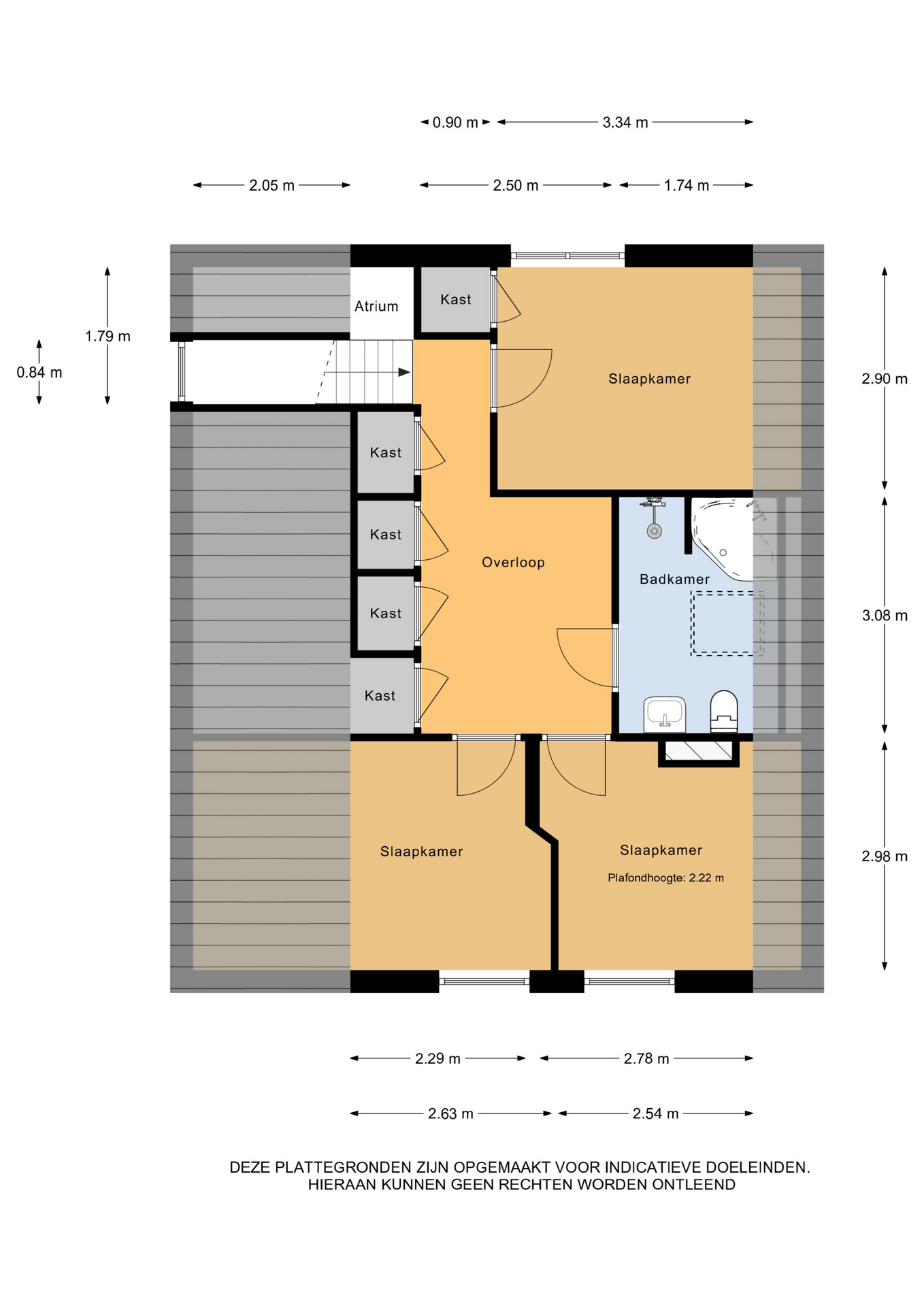 1e Verdieping: overloop met drie vaste kasten en berging – ouderslaapkamer met vaste kast – twee slaapkamers – compleet ingerichte badkamer.