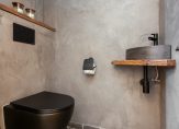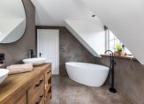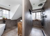 De badkamer is luxe en doordacht. Er is een dubbele inloop regendouche aanwezig, een ruim badmeubel met twee waskommen en een tweede toilet. Het vrijstaande bad maakt de ruimte af.