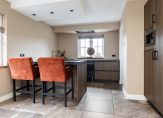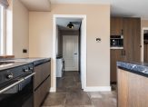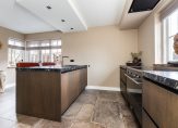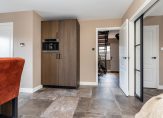 De keuken is luxe uitgevoerd en voorzien van een Quooker in het spoeleiland, extra ruime koelkast, ingebouwd koffieapparaat, vaatwasser, inductiekookplaat, dubbele oven en veel kastruimte. Door de openslaande deuren bereik je het terras aan de zijkant, hier kun je heerlijk buiten eten.