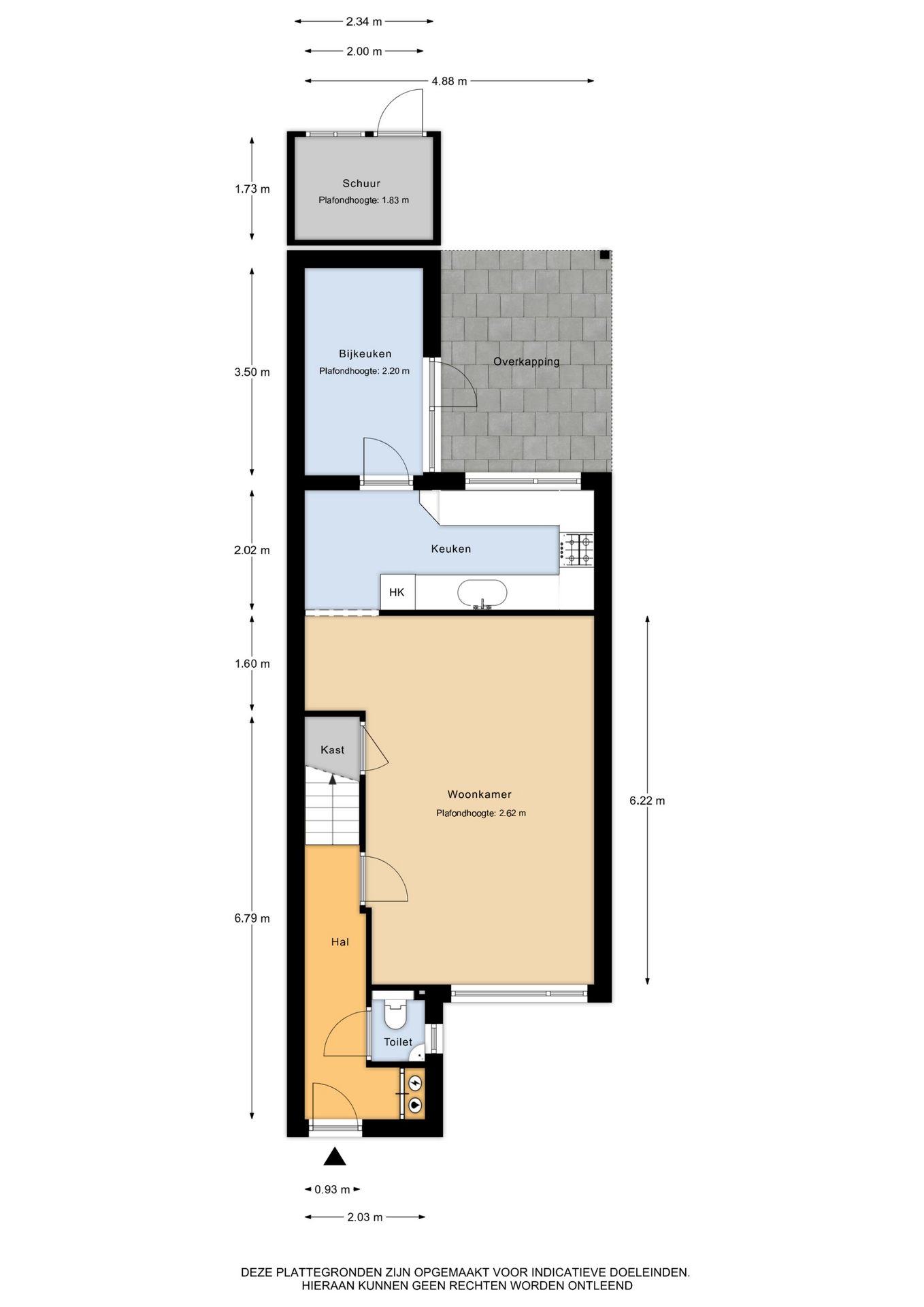 Begane grond: entree/ hal – toilet met fonteintje – meterkast – woonkamer – half open keuken – bijkeuken met achteringang.