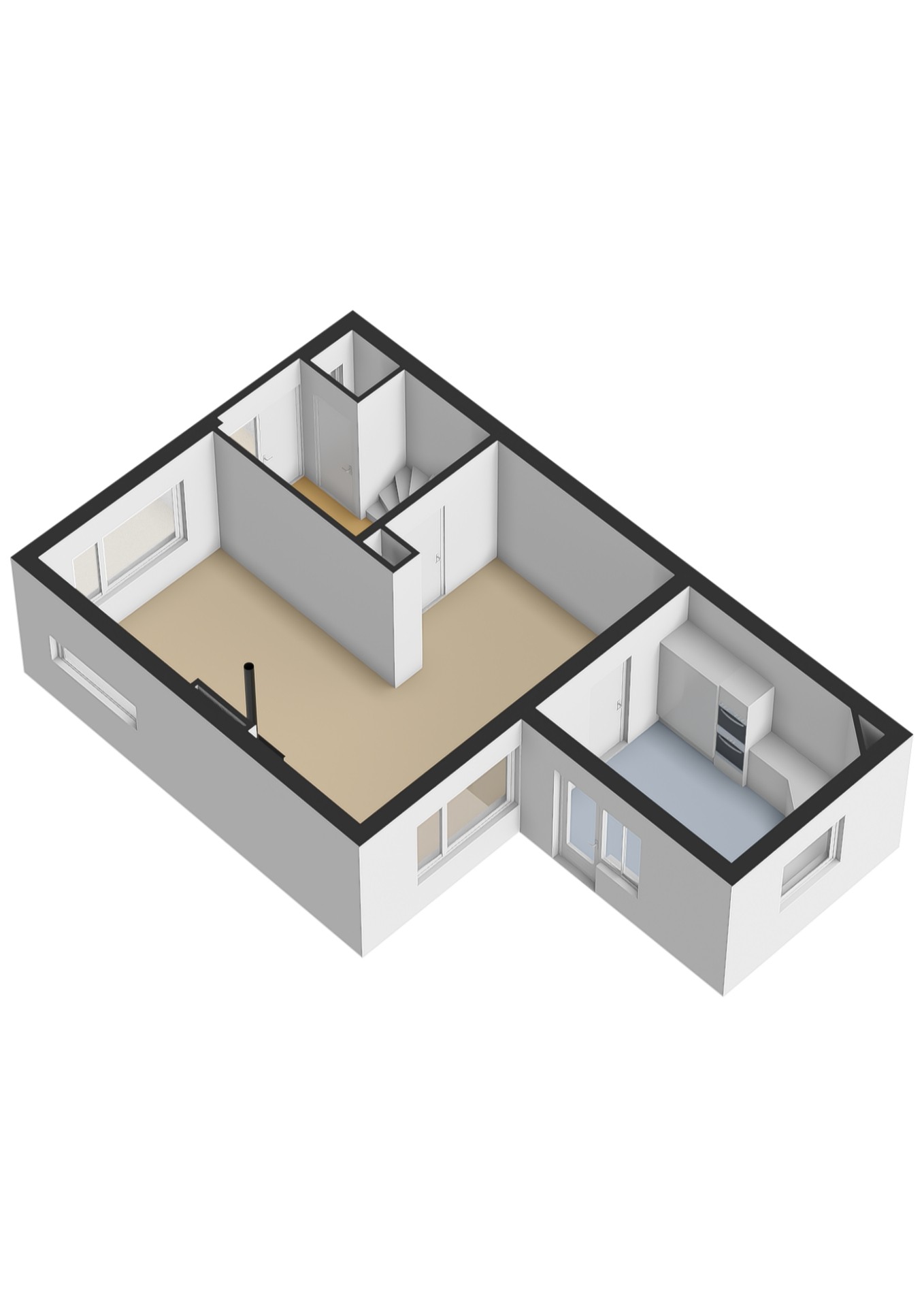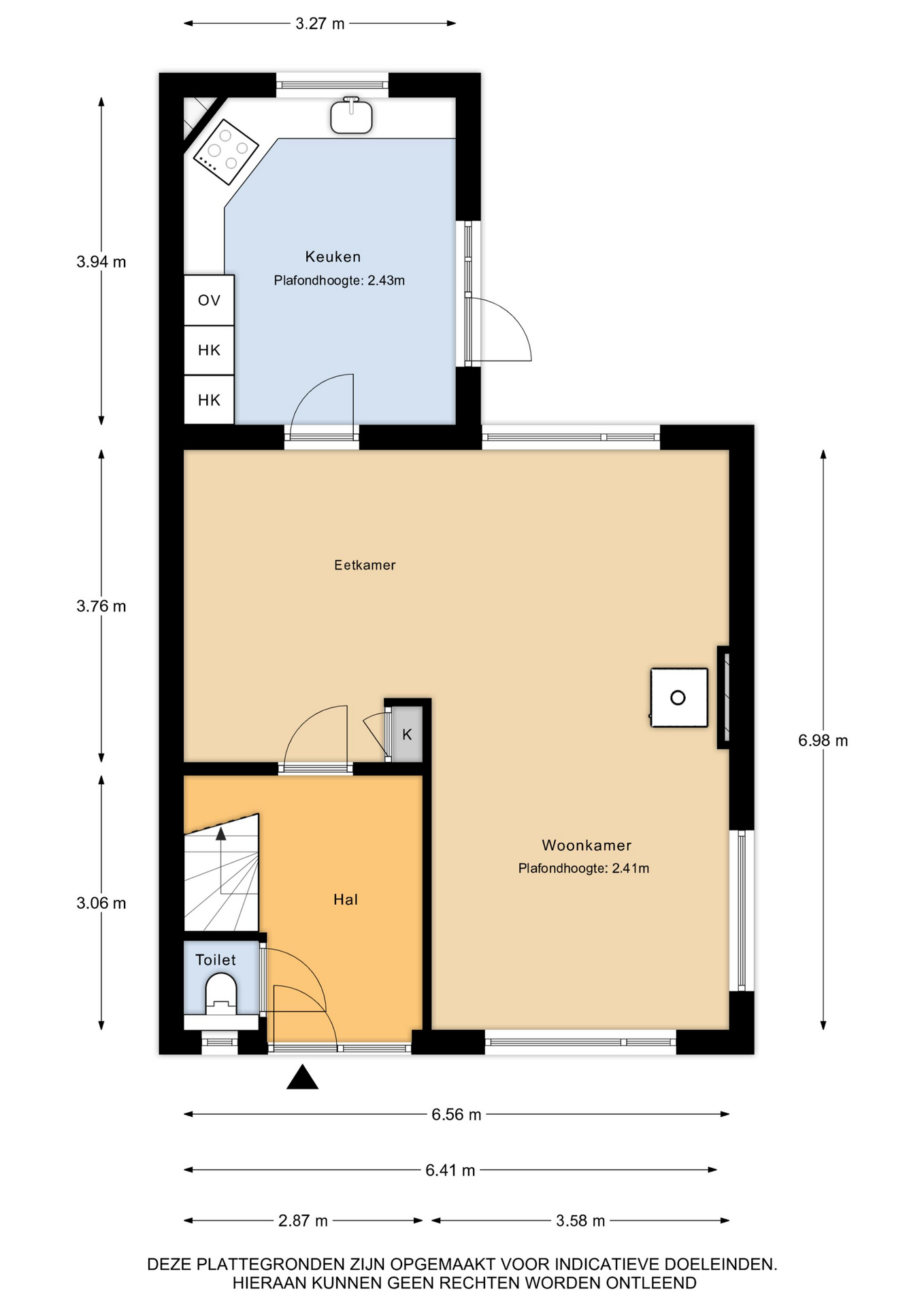 Begane grond: entree/ hal – toilet – trapopgang – L-vormige woonkamer – dichte keuken met achteringang. De keuken is voorzien van een quooker, vaatwasser, combi-magnetron, koelkast, inductiekookplaat met afzuigkap en wasmachine.