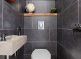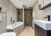 1e Verdieping: overloop – vier slaapkamers – badkamer met ligbad, inloopdouche, toilet en wastafelmeubel.