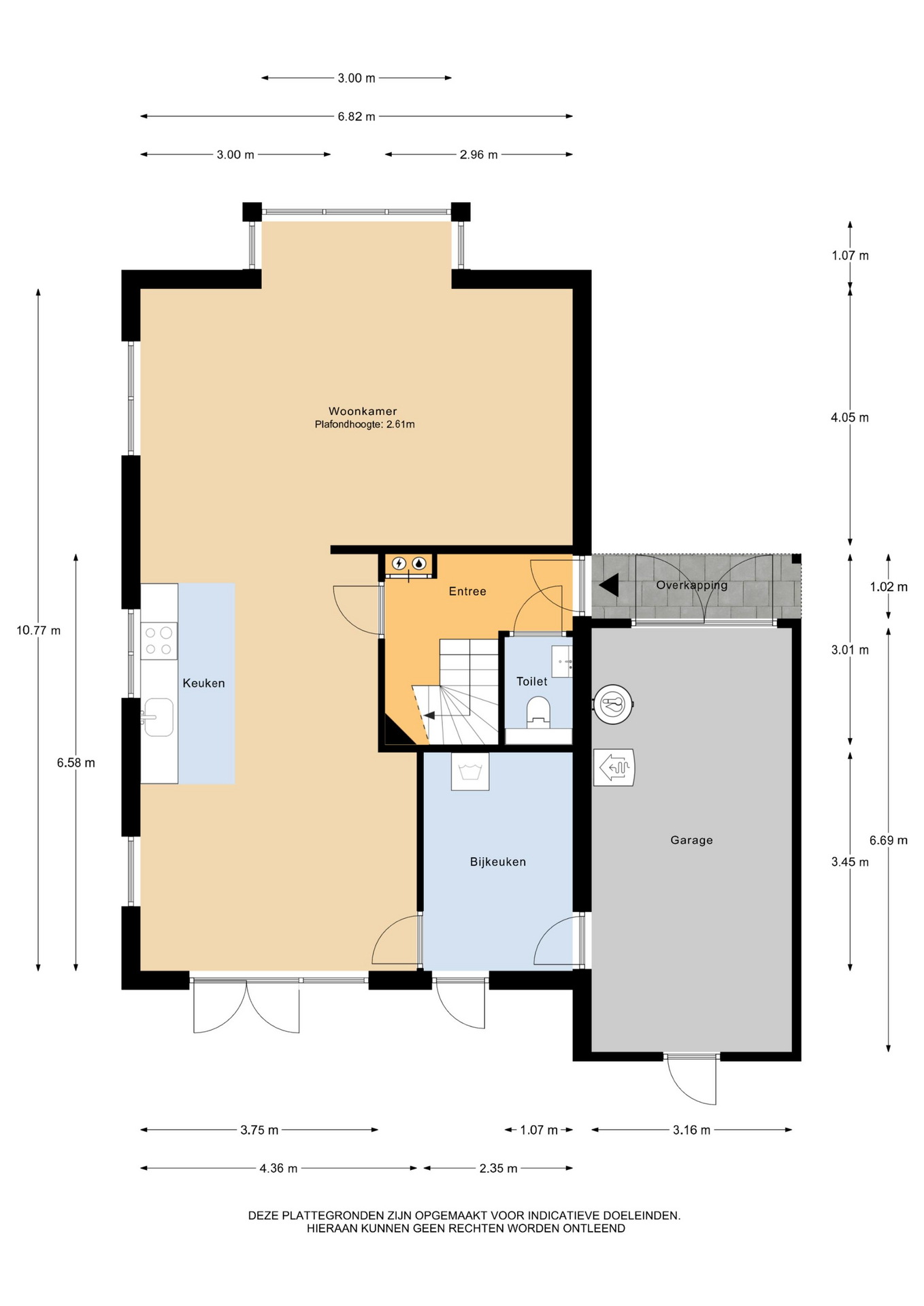 Begane grond: entree/ hal – toilet – trapopgang – woonkamer met erker – open keuken – eetkamer met openslaande terrasdeuren – bijkeuken met achteringang en toegang tot de aangebouwde garage.
