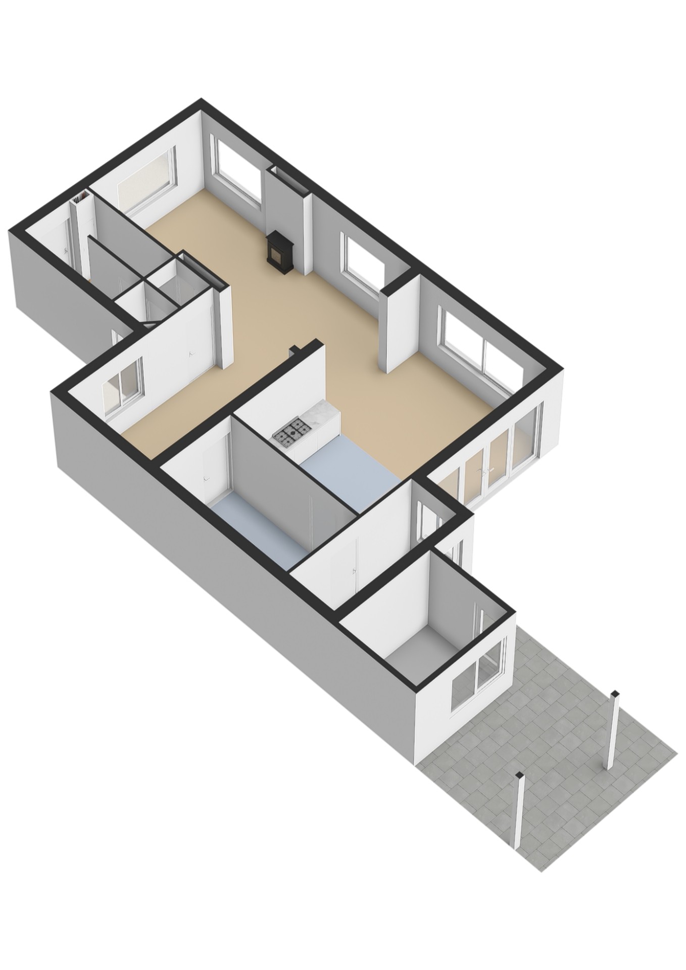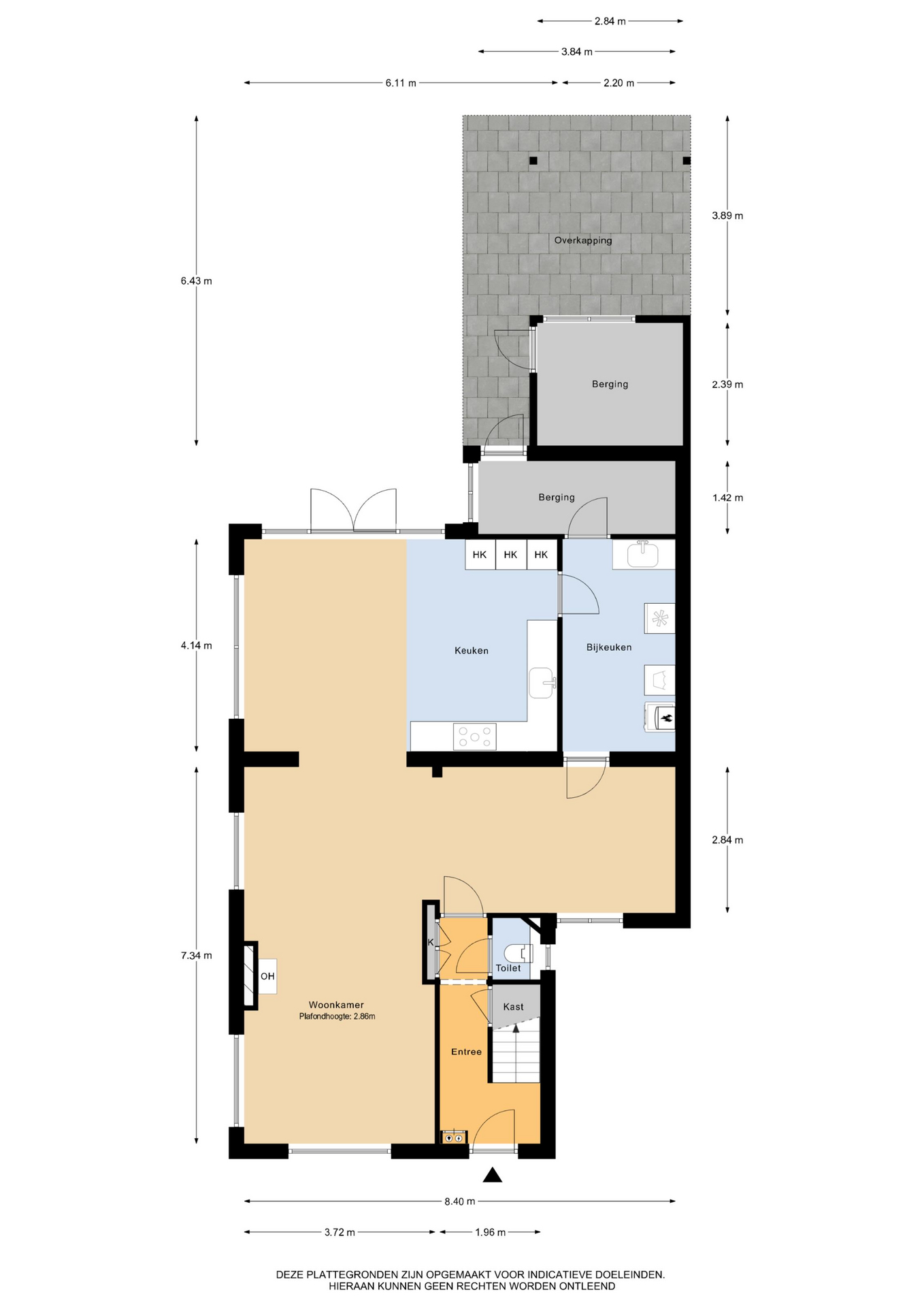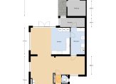 Begane grond: entree/ hal – toegang tot de kelder – toilet – woonkamer met ruime speel-/ werkhoek – toegang tot de bijkeuken – open woonkeuken met openslaande deuren naar het terras – toegang tot de bijkeuken – berging/ achteringang
