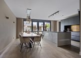 In de ruime hal met modern toilet krijgt u al een voorproefje van de stijl, die zich door het hele huis voortzet. De zitkamer is een heerlijke plek om te ontspannen, veel lichtinval door de grote raampartij van de erker en afgesloten met elegante stalen en suite deuren. De eetkamer met openslaande tuindeuren vormt het hart van het huis en staat in open verbinding met de woonkeuken: een droom voor iedere kookliefhebber. Het kookeiland met composiet aanrechtblad en wijnkoeler nodigt uit tot lange avonden met familie en vrienden. Achter de keuken bevindt zich de bijkeuken, voorzien van een kastenwand, wasmachineaansluiting en tuindeur. Aansluitend vindt u de berging.