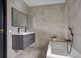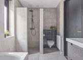 – badkamer met ligbad, inloopdouche, badkamermeubel met dubbel wastafel en hangend toilet.