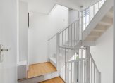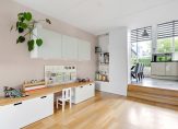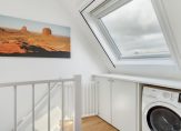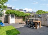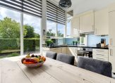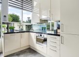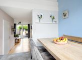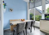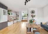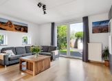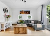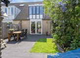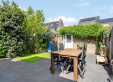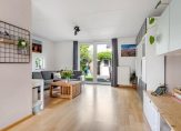 De ruime, tuingerichte woonkamer is een heerlijke leefruimte met zijramen, openslaande deuren naar de zonnige tuin en een warme lamelparketvloer. Het speels ontworpen trappenhuis geeft een leuke dieptewerking aan het geheel. Op een hoger niveau vind je de hoekkeuken, compleet met granieten aanrechtblad en inbouwapparatuur — ideaal voor de kookliefhebber!