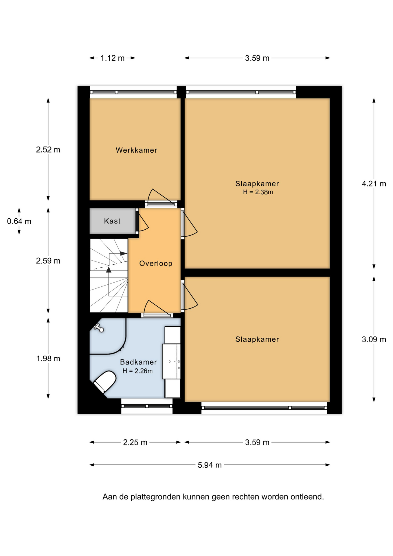 Overloop met vaste kast voor extra bergruimte. Drie prima slaapkamers waarvan de grootste twee met vaste kasten. Aan de voorzijde van de woning is de badkamer gesitueerd met douchecabine, wastafelmeubel, handdoekradiator en 2e toilet. Vaste trap naar de 2e verdieping.