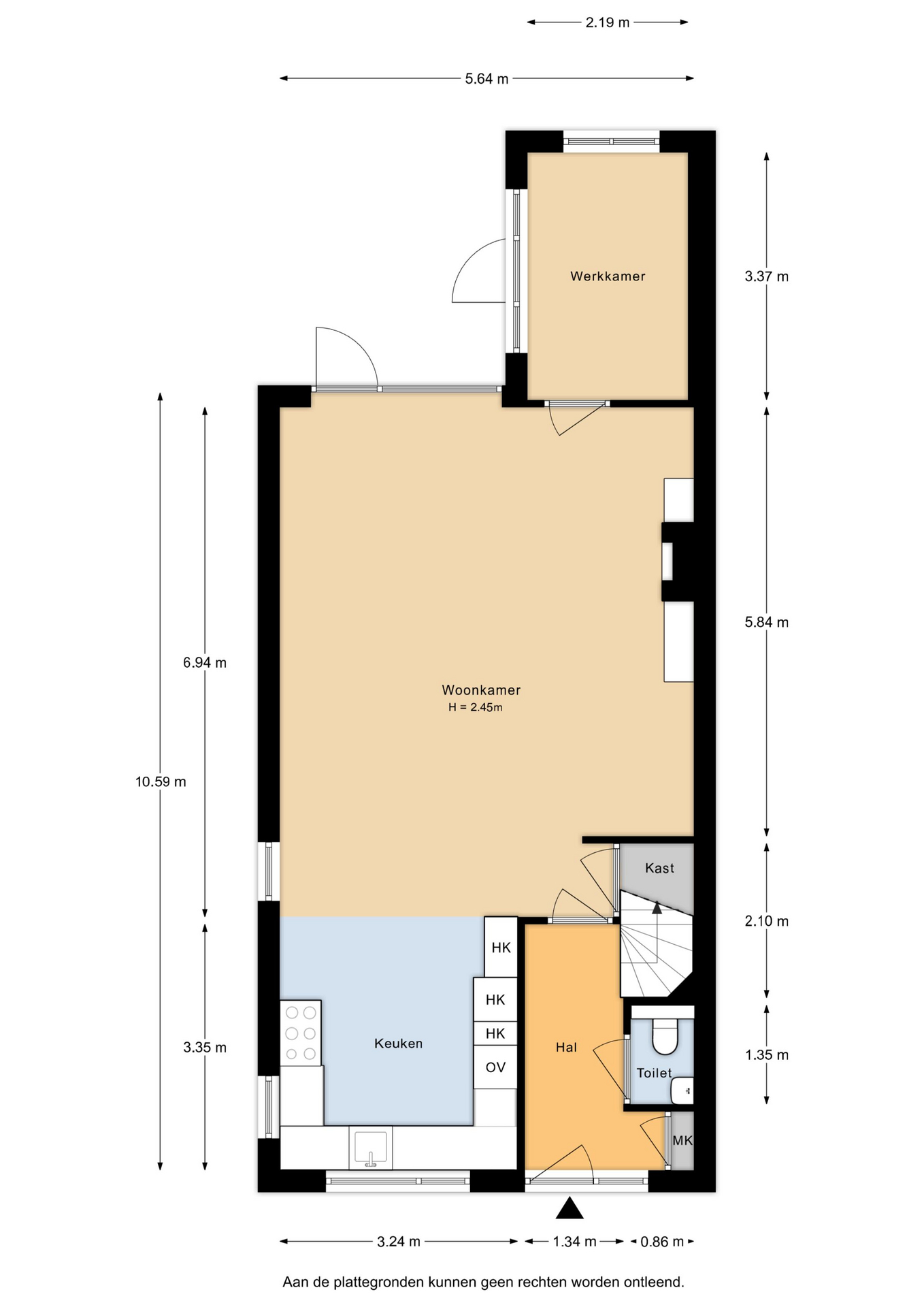 Entree via de voortuin. Hal met meterkast, toilet en de trapopgang naar de eerste verdieping. Toegang tot de royale woonkamer, met grote raampartijen aan zowel de voor- als achterzijde die zorgen voor een bijzonder prettige lichtinval. Daarnaast beschikt de woonkamer over zijramen, waardoor er nog meer natuurlijk licht de ruimte binnenvalt. De woonkamer beschikt over een gezellige open haard die de ruimte extra sfeer en warmte geeft. Aan de voorzijde bevindt zich de moderne keuken (2018), uitgevoerd in een lichte kleurstelling en voorzien van diverse inbouwapparatuur, waaronder een oven, kookplaat, afzuigkap en vaatwasser. Werk/hobbykamer aan de tuinzijde met net als vanuit de woonkamer toegang tot de achtertuin.