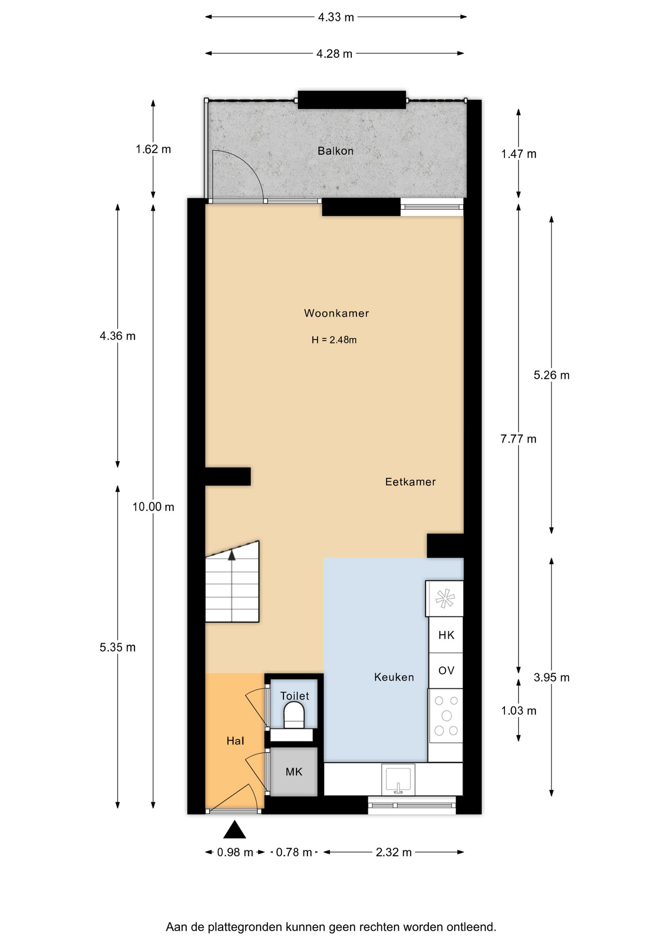 Appartementsentree met meterkast, toilet en trapopgang. Open verbinding naar de woon-/eetkamer met open keuken. Aan de voorzijde bevindt zich de open keuken, uitgevoerd in een praktische opstelling en voorzien van diverse inbouwapparatuur zoals een oven, vaatwasser, 5 pits gaskomfoor en afzuigkap. De woonkamer is naar de voorzijde van het complex gesitueerd met balkon. Gelegen op het zuid/westen, een fijne plek om buiten te zitten en te genieten van de buitenlucht.