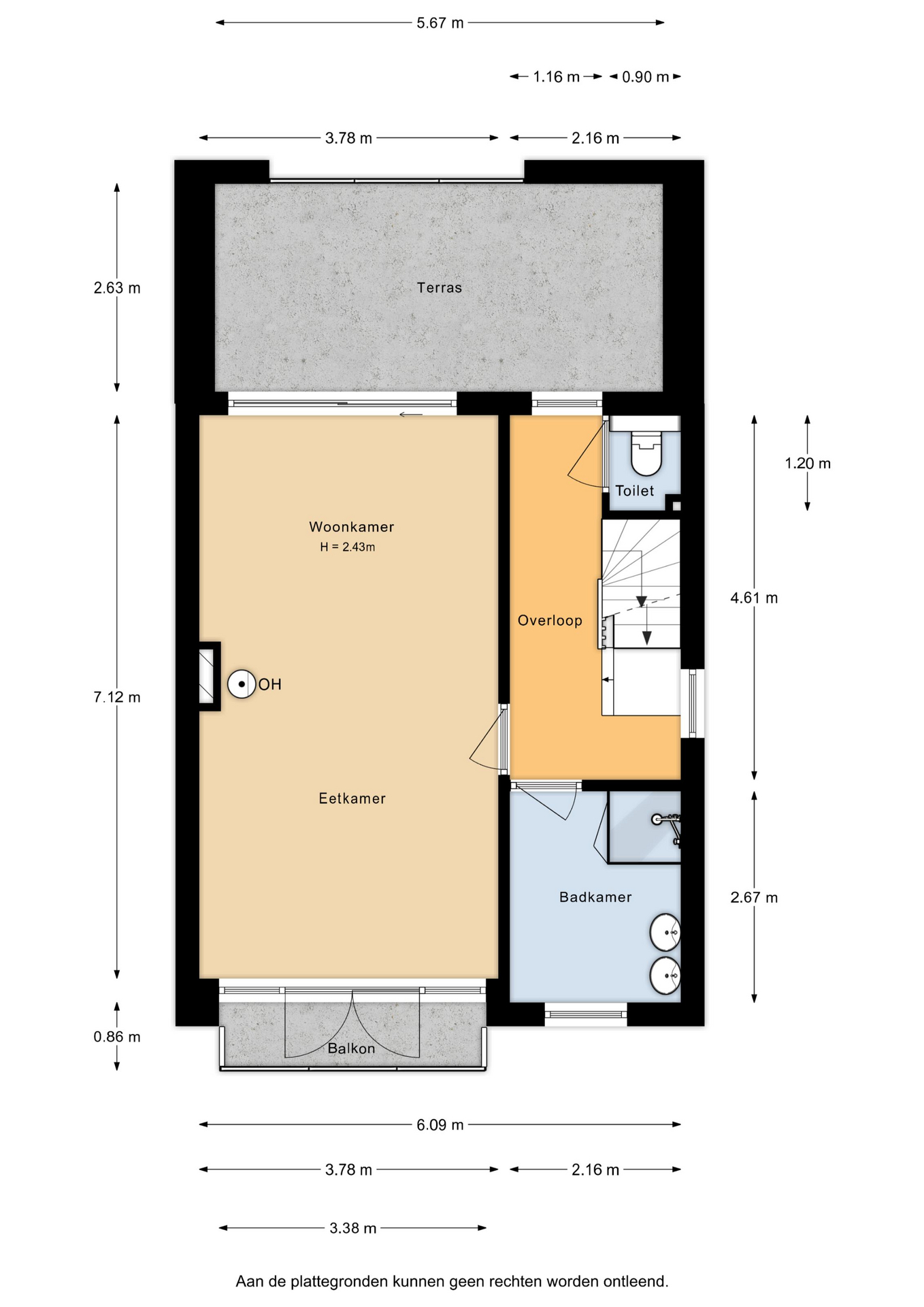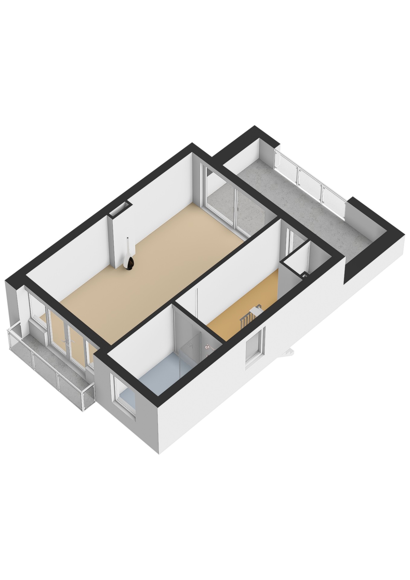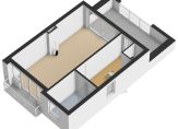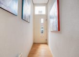 Overloop met separaat toilet en trapopgang naar de 2e verdieping. Riante woon/werkkamer met aan de voorzijde toegang tot het balkon en aan de achterzijde tot het zonnige dakterras. Moderne badkamer met douche en dubbele wastafel.