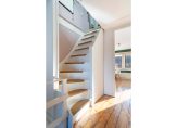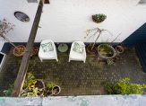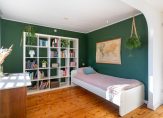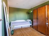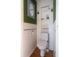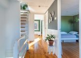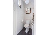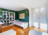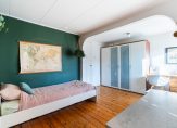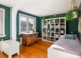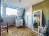 Overloop met separaat toilet en vaste kast. Twee ruime slaapkamers, beide met een goede lichtinval en een praktische indeling. Eén van de slaapkamers is extra ruim door de samenvoeging met de oorspronkelijke 3e slaapkamer. Vanuit de overloop eveneens toegang tot het platte (groene dak) aan de achterzijde en een vaste trap naar de 2e verdieping.
