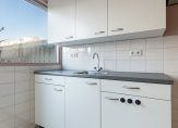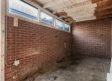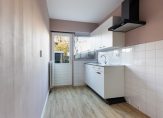 Gesloten keuken met keukenblok in een rechte opstelling voorzien van een afzuigkap. Vanuit de keuken toegang tot de diepe achtertuin met ruime stenen berging en het achterom.