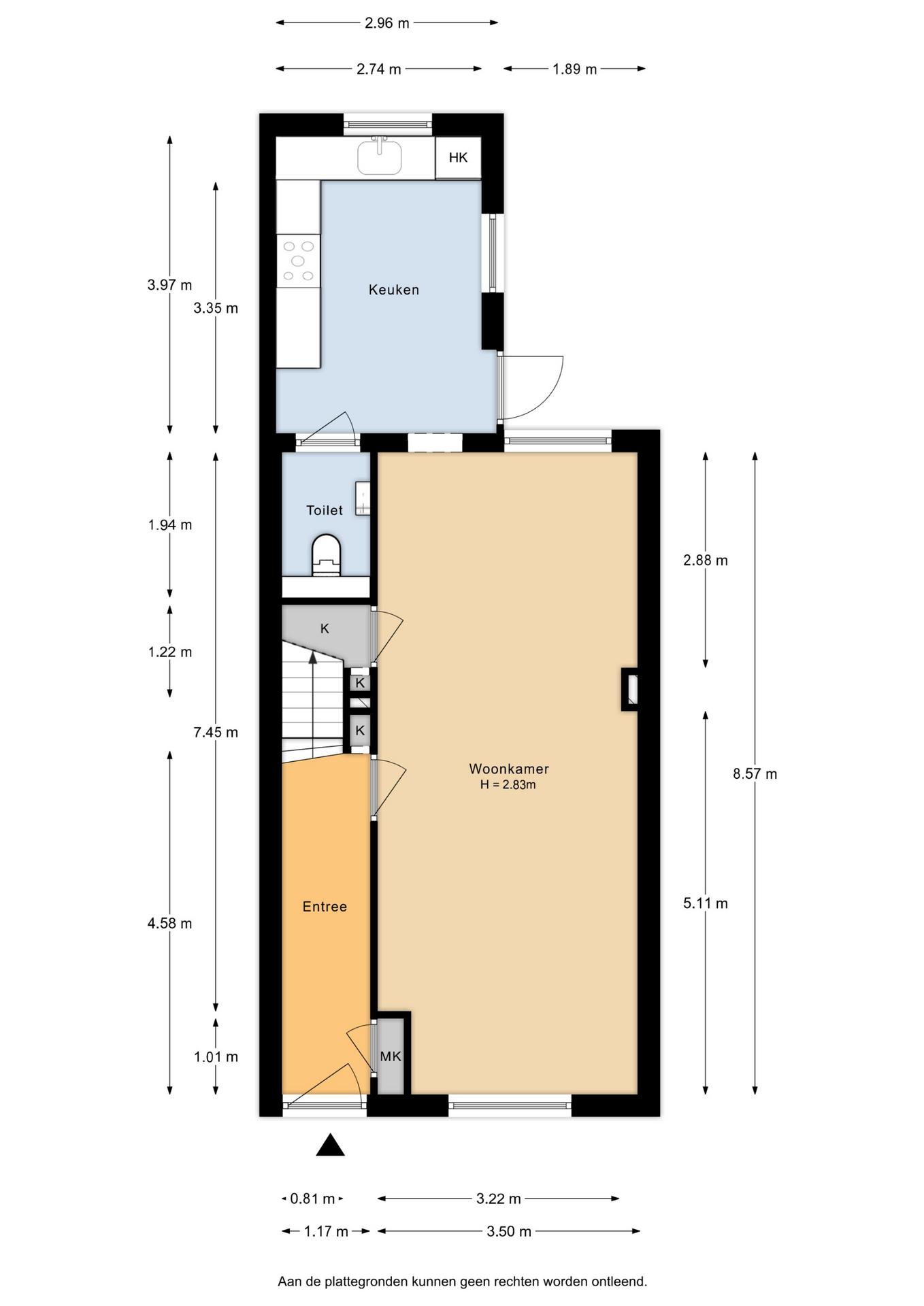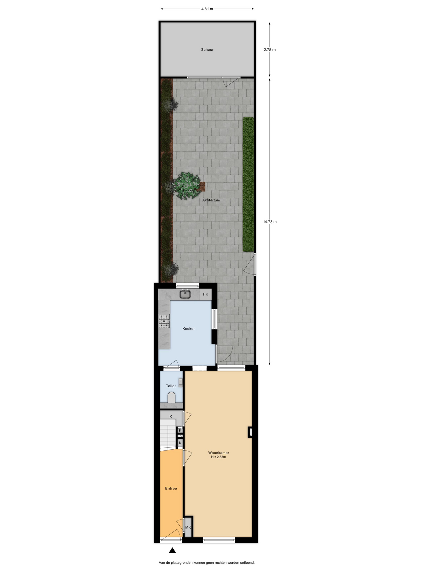 Entree. Gang met trapopgang naar de 1e verdieping en toegang tot de woonkamer van circa 28 m2 en aangebouwde woonkeuken (ca. 11m2) aan de achterzijde voorzien van diverse apparatuur. Tevens vanuit de keuken toegang tot toilet en de riante zonnige achtertuin met de vrijstaande stenen berging en het achterom.