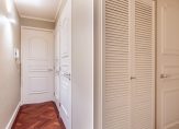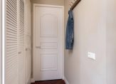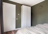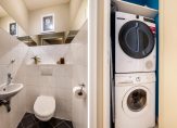 Appartementsentree: hal met vaste kast met wasmachine- en drogeraansluiting, garderobenis/bergkast, toegang tot de slaapkamer, badkamer, toiletruimte en woonkamer.