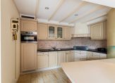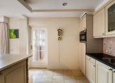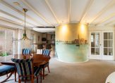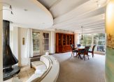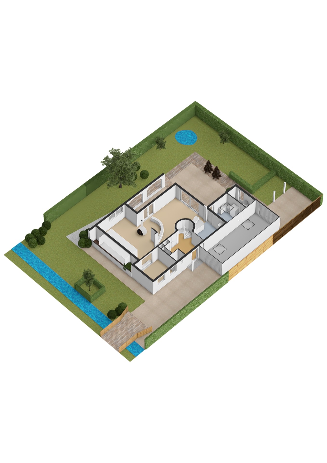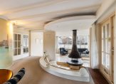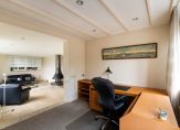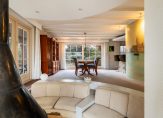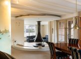 De woonkamer heeft een oppervlakte van bijna 70 m2 en beschikt over grote raampartijen met uitzicht op de tuin en het water. De indeling met niveauverschillen en ronde vormen zorgt voor een open leefruimte met verschillende gebruikszones. De keuken heeft een praktische hoekopstelling en geeft ook toegang tot de bijkeuken met de opstelplaats van de C.V. ketel en de aansluitpunten voor wasmachine/droger. Vanuit hier ook toegang tot de tuin en tot de garage. Riante buitenruimte met achter, voor en zij-tuin.