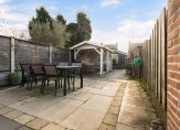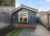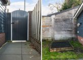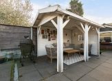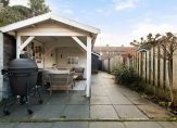 Magnifieke voortuin met vrijstaande houten berging en gezellige terrasoverkapping.