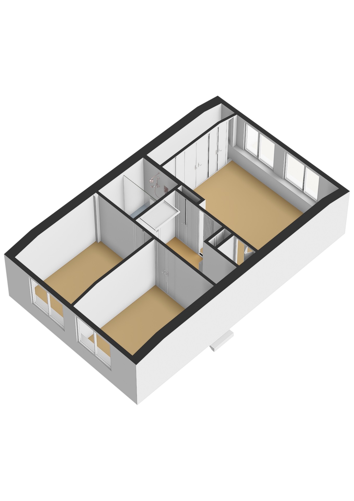 Overloop met bergruimte en inpandige badkamer met wastafelmeubel en inloopdouche. Royale slaapkamer aan de voorzijde en twee slaapkamers aan de achterzijde. Zowel aan de voor als achterzijde een dakkapel. Laminaat vloerafwerking.