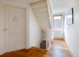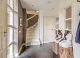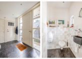 In de ruime hal zie je direct dat dit een huis met ruimte, sfeer en stijl is. De hardstenen vloer met vloerverwarming past goed bij de paneeldeuren en rechts in de hal, naast de meterkast, is de ruime toiletruimte met toilet en urinoir. Aan de andere zijde van de hal zijn twee trappen, naar de eerste verdieping en de stahoge, ruime wijn-/provisiekelder.