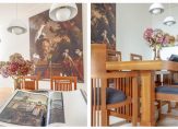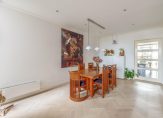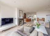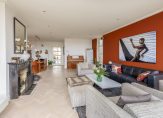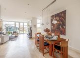 De circa 9.50 meter diepe woonkamer is een blikvanger, met een visgraatvloer en een klassieke schouw met open haard. Grote ramen met een fraaie raamindeling zorgen voor veel lichtinval en openslaande deuren geven toegang tot de tuin. Het zitgedeelte is aan de tuinzijde en aan de andere zijde, vlak naast de keuken, is plek voor een grote eettafel. Maar dat is niet de enige plek om te eten …