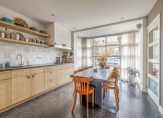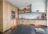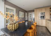 Hou je van koken en eten in dezelfde ruimte? Dan is deze woonkeuken (Piet Boon model) de perfecte plek! Er ligt dezelfde vloer als in de hal en de erker met vele ramen zorgt voor veel lichtinval. De massief houten keukenopstelling van topkwaliteit heeft een aanrechtblad van hardsteen en een dubbele gootsteen, waarvan een met een douchekraan. Alle benodigde apparatuur is ingebouwd: een 5-pits gaskookplaat, afzuiging in schouw, een vaatwasser, oven, magnetron en een koel-/vriescombinatie.
