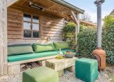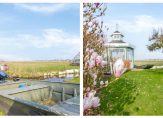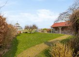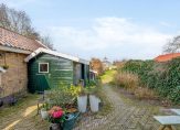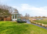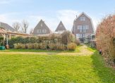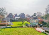 En dan de achtertuin, die gerust uniek genoemd mag worden. De L-vormige tuin biedt ruimte aan een houten berging, de grote multifunctionele schuur met viering en veranda. Links achter in de tuin staat een romantisch theehuis met bekabelde internetaansluiting. Een inspirerende werkplek? Verder zie je een frisgroen gazon en prachtige beplanting. Naast het theehuis is een helling gemaakt, waardoor de boot ook op het droge kan liggen. En voordat je weggaat, neem even plaats in het theehuisje en geniet nog even in stilte van het uitzicht naar de polder …