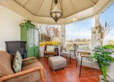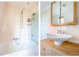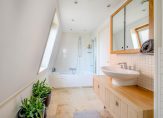 De badkamer met marmeren vloer is ingedeeld met een ligbad/douchecombinatie, een breed wastafelmeubel met spiegelkast en een wandcloset. Een van de pluspunten is de lichtinval, via ramen aan twee zijden.