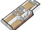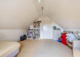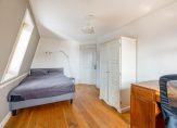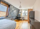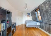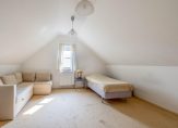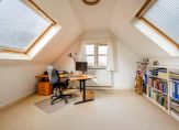 De slaapkamer aan de voorzijde is ingericht als ruime logeerkamer en de kamer aan de achterzijde, met twee dakramen en een gevelraam, als werkkamer.