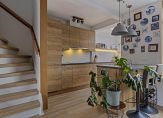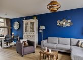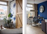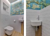 De ruimte in de hal is optimaal benut. Er is een open kast gemaakt voor de jassen en schoenen en recht voor je is de toiletruimte, met een fraaie uitstraling. Witte wandtegels zijn gecombineerd met stucwerk, kleurrijk behang en modern sanitair.