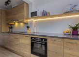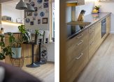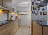 In de moderne keuken, die in 2021 geplaatst is, is niet alleen gekeken naar functionaliteit, maar ook naar de juiste looks. Aan het spoeleiland kunnen twee hoge stoelen staan en de inductiekookplaat, afzuigkap, vaatwasser, oven, koelkast en vriezer zijn ingebouwd. Vroeger was de keuken een stuk kleiner, maar nu is het een verrassend grote ruimte met veel lichtinval en een deur naar de tuin.