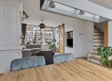 Wat een sfeer heeft de woonkamer, met het zitgedeelte aan de voorzijde en het eetgedeelte vlak naast de keuken. Het plafond en de muren zijn gestuct, alles zit goed in de verf en onder de pvc-vloer ligt, net als op de rest van de begane grond, vloerverwarming.