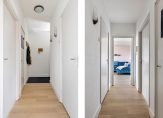 Als je boven bent, dan zie je twee voordeuren. Bij nummer 60 loop je naar binnen, naar de ruime hal. Om spullen op te bergen is er een handige bergkast, naast de kapstok.