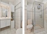 Aan de koele noordzijde zijn twee ruime slaapkamers, waarvan een met een balkon. Deze kamer is, ook al is het niet de grootste, ingericht als master bedroom. In de tweede (dit is de grootste) slaapkamer staan momenteel een grote kastenwand en een logeerbed. Ook de badkamer is vanuit de hal te bereiken. Deze ruimte is ingedeeld met een douche, toilet, wastafelmeubel en een handdoekenradiator. Dan hebben we alles gehad, behalve een plek voor de wasmachine en droger…