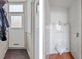 In de hal met hoog plafond zie je een hoog plafond, een mooie lambrisering en de meterkast. Ook kun je vanuit de hal de toiletruimte, met een wandcloset en lichte wandtegels bereiken.