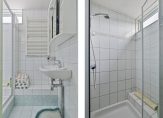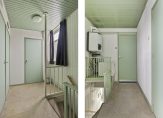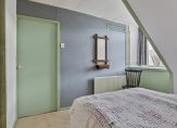 Niet alleen het schilderwerk op de eerste verdieping, maar ook de badkamer is uitgevoerd in verschillende groentinten. De ruimte, met een raam voor lichtinval, is ingedeeld met een douche, wastafel, spiegelkast en een handdoekenradiator.