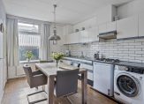 De woon-/eetkamer met open keuken heeft een oppervlakte van circa 26 m2, met veel lichtinval aan twee zijden. In de keuken valt je oog op de wandopstelling met een dubbele spoelbak, een ingebouwde gaskookplaat en een afzuigkap.