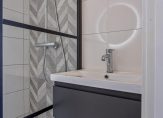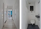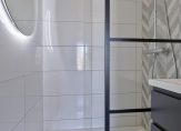verlichting en de patroontegels in de douche. Naast de badkamer is de toiletruimte, ingedeeld met een wandcloset en een fonteintje.