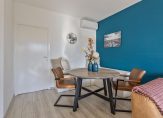 De woonkamer bevindt zich, net als de halfopen keuken, aan de voorzijde. Beide ruimtes geven toegang tot het balkon en via de grote ramen valt veel licht naar binnen. De afwerking is fraai met stucwerk, laminaat op de vloer en bij het eetgedeelte hangt een airco-unit die kan koelen en verwarmen.