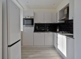 In de keuken staat een lichte hoekopstelling met een marmerlook aanrechtblad en zwarte tegels op de achterwand. De gaskookplaat, afzuigkap, vaatwasser en oven zijn ingebouwd waardoor je, nadat de verhuizer een koel-/vriescombinatie heeft neergezet, kan beginnen met koken.