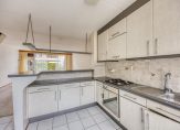 Aan de voorzijde is er de ruime L-vormige keuken met veel werkruimte en een verhoogde bar. De keuken beschikt over een ingebouwde gaskookplaat, afzuigkap, oven en losse koel-/vriescombinatie.